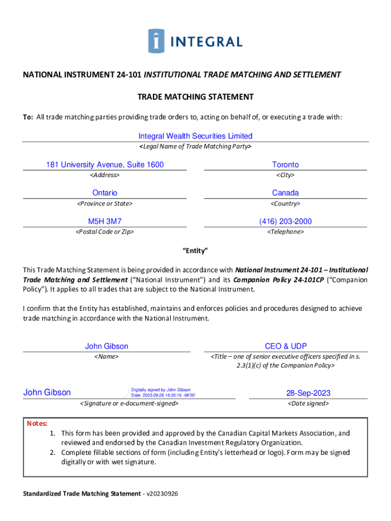 NATIONAL INSTRUMENT 24101 INSTITUTIONAL TRADE MATCHING AND SETTLEMENT