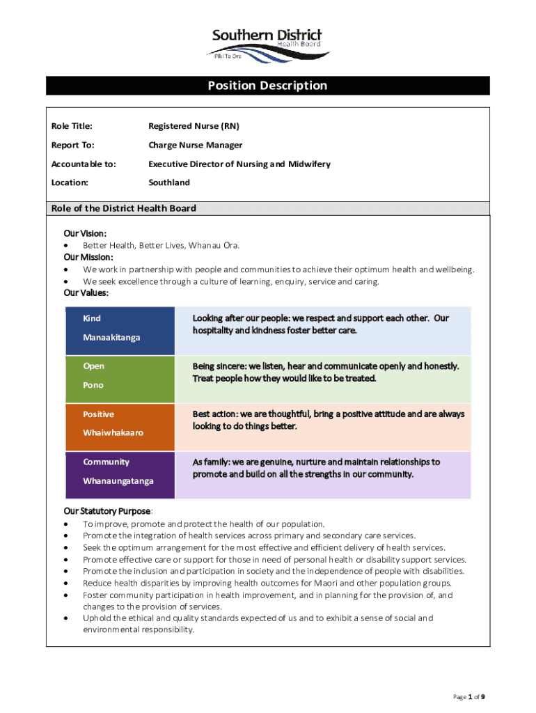 Position Description Role Title:Registered Nurse (RN)Report To:Charge Nurse ManagerAccountable to:Executive Director of Nursing and MidwiferyLocation:SouthlandRole of the District Health Board Our