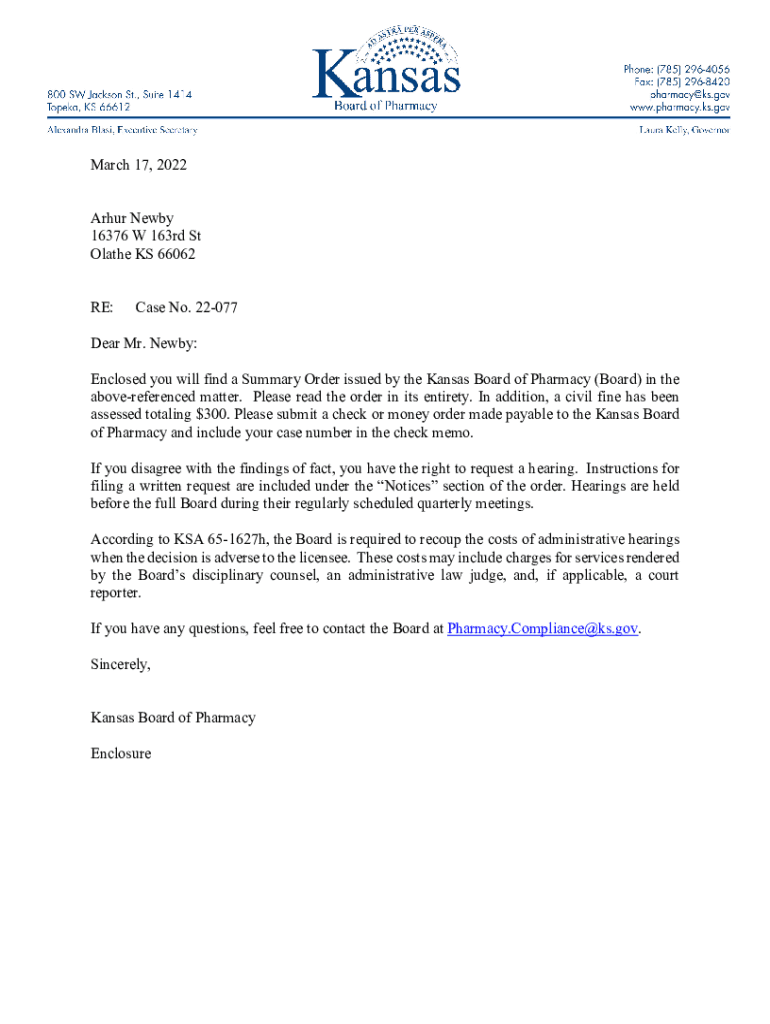 Enclosed you will find a Summary Order issued by the Kansas Board of Pharmacy (Board) in the