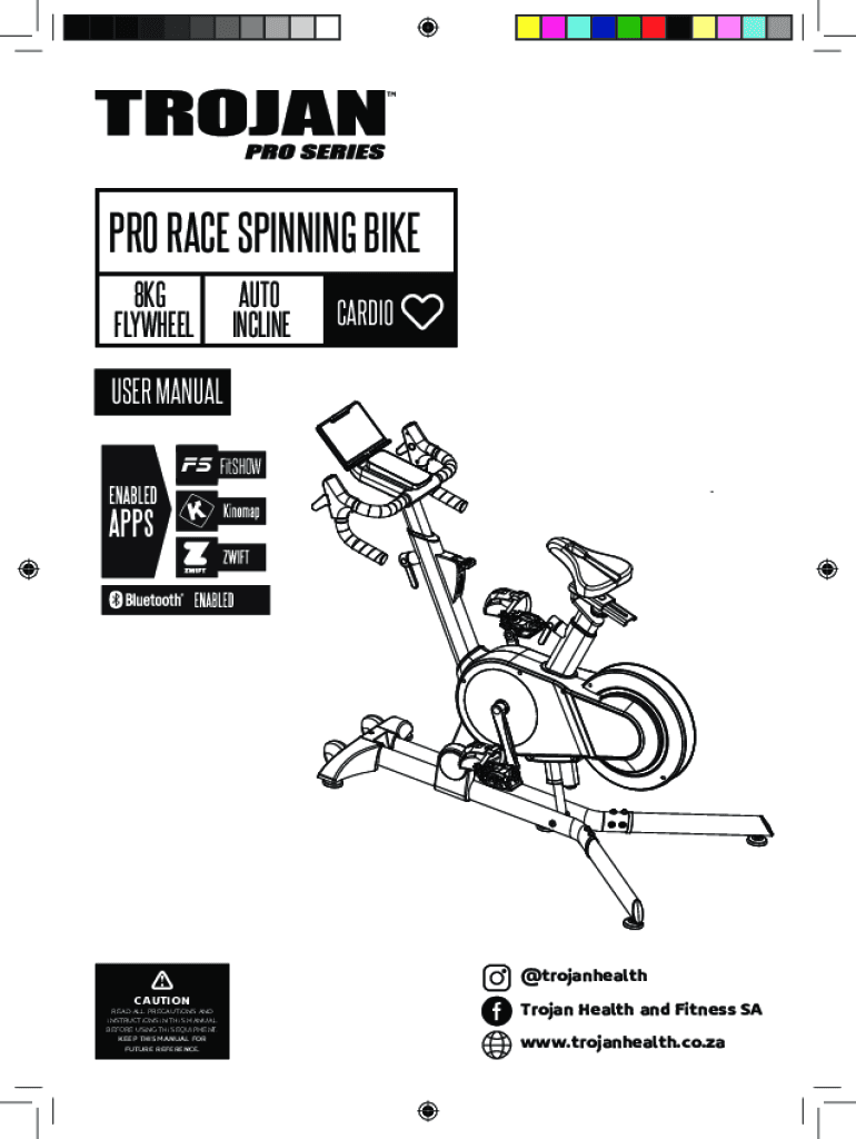 PRO RACE SPINNING BIKE 8KG FLYWHEELAUTO INCLINECARDIOUSER MANUAL FitSHOW@trojanhealth CAUTIONREAD ALL PRECAUTIONS AND INSTRUCTIONS IN THIS MANUAL BEFORE USING THIS EQUIPMENT. KEEP THIS MANUAL FOR