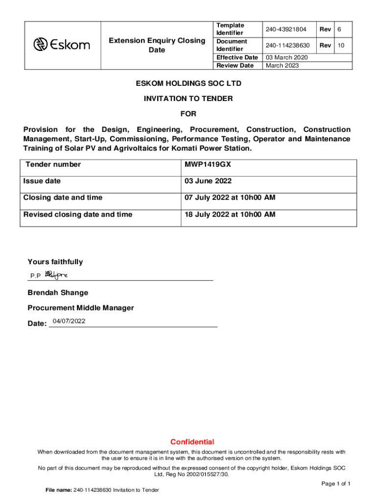Extension Enquiry Closing DateTemplate Identifier Document Identifier Effective Date Review Date24043921804Rev6240114238630Rev1003 March 2020 March 2023ESKOM HOLDINGS SOC LTD INVITATION TO TENDER