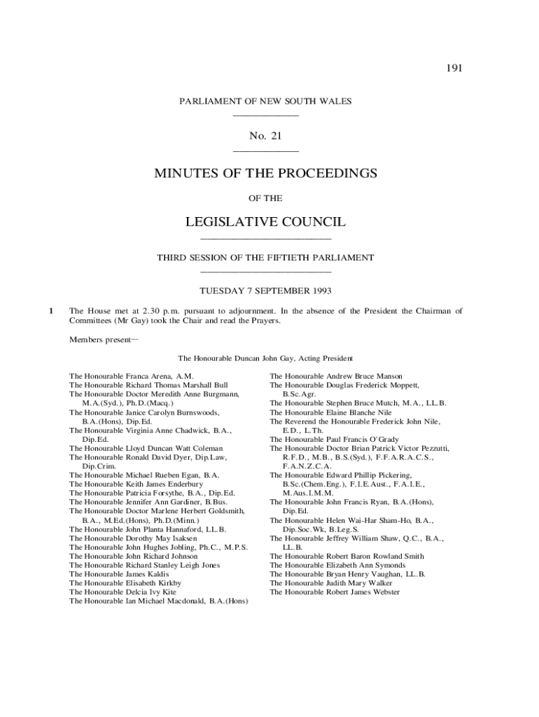 191 PARLIAMENT OF NEW SOUTH WALES___No. 21 ___MINUTES OF THE PROCEEDINGS OF THELEGISLATIVE COUNCIL ___ THIRD SESSION OF THE FIFTIETH PARLIAMENT___ TUESDAY 7 SEPTEMBER 1993 1The House met at 2.30 p.m.