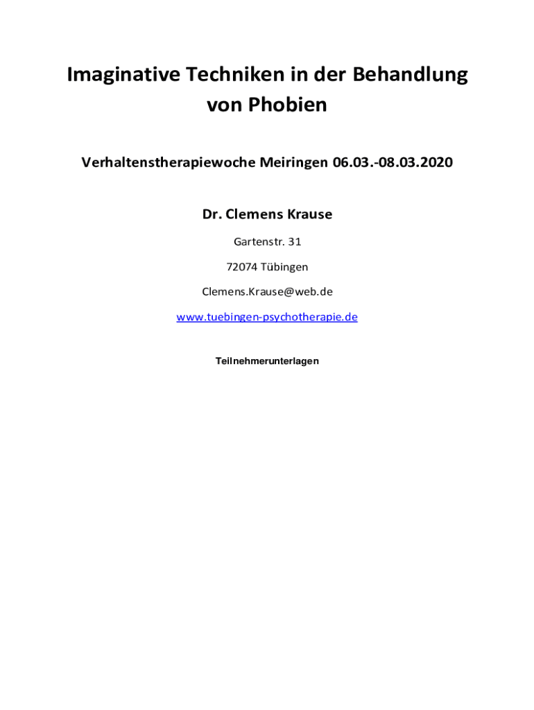 Imaginative Techniken in der Behandlung von Phobien Verhaltenstherapiewoche Meiringen 06.03.08.03.2020 Dr. Clemens Krause Gartenstr. 31 72074 Tbingen Clemens.Krause@web.de www.tuebingenpsychotherapie.deTeilnehmerunterlagenGliederung: