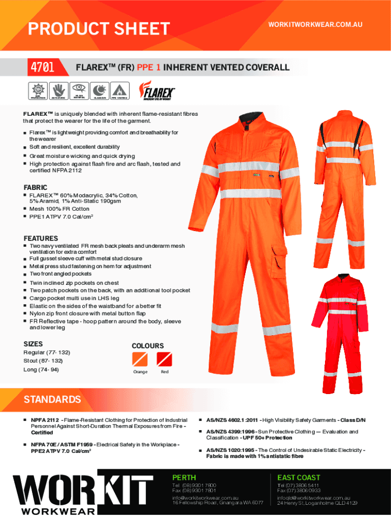 PRODUCT SHEET 4701FLAREXTM (FR) PPE 1 INHERENT VENTED COVERALLFEATURINGScotchliteWORKITWORKWEAR.COM.AUFEATURING FEATURINGScotchlite ScotchliteTMReflective Material SUN COOL SUN T LIGHTWEIGHT ANTISTATIC
