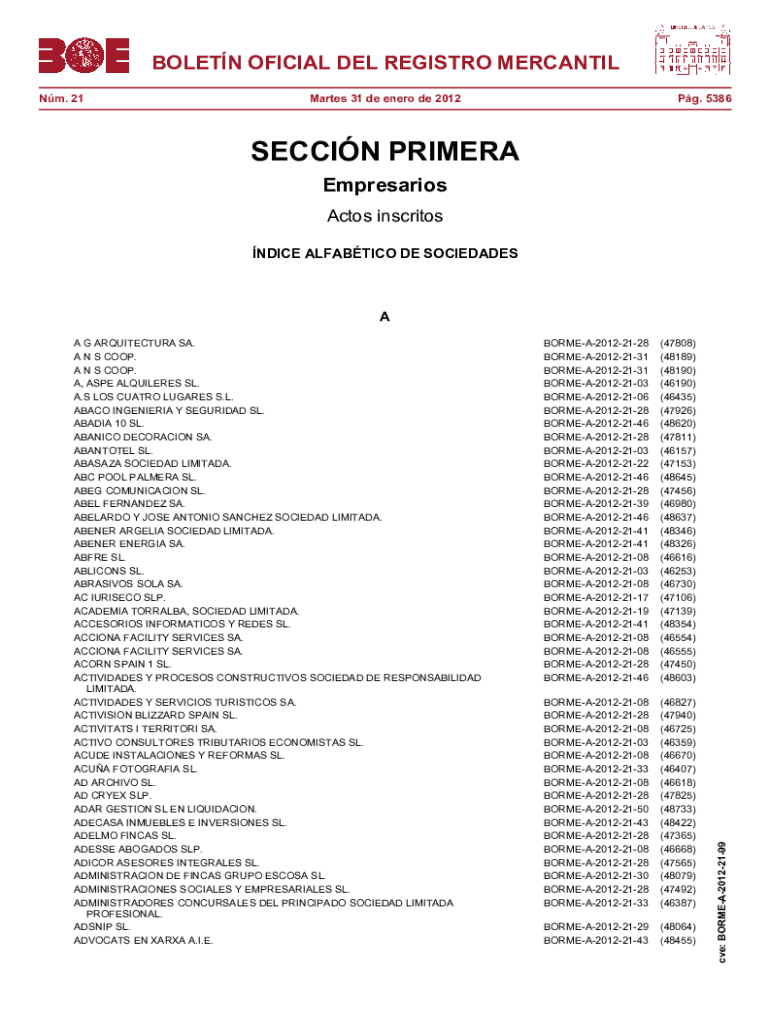 BOLETN OFICIAL DEL REGISTRO MERCANTIL Nm. 21Martes 31 de enero de 2012Pg. 5386SECCIN PRIMERA Empresarios inscritos NDICE ALFABTICO DE SOCIEDADESA G ARQUITECTURA SA. A N S COOP. A N S COOP. A, ASPE