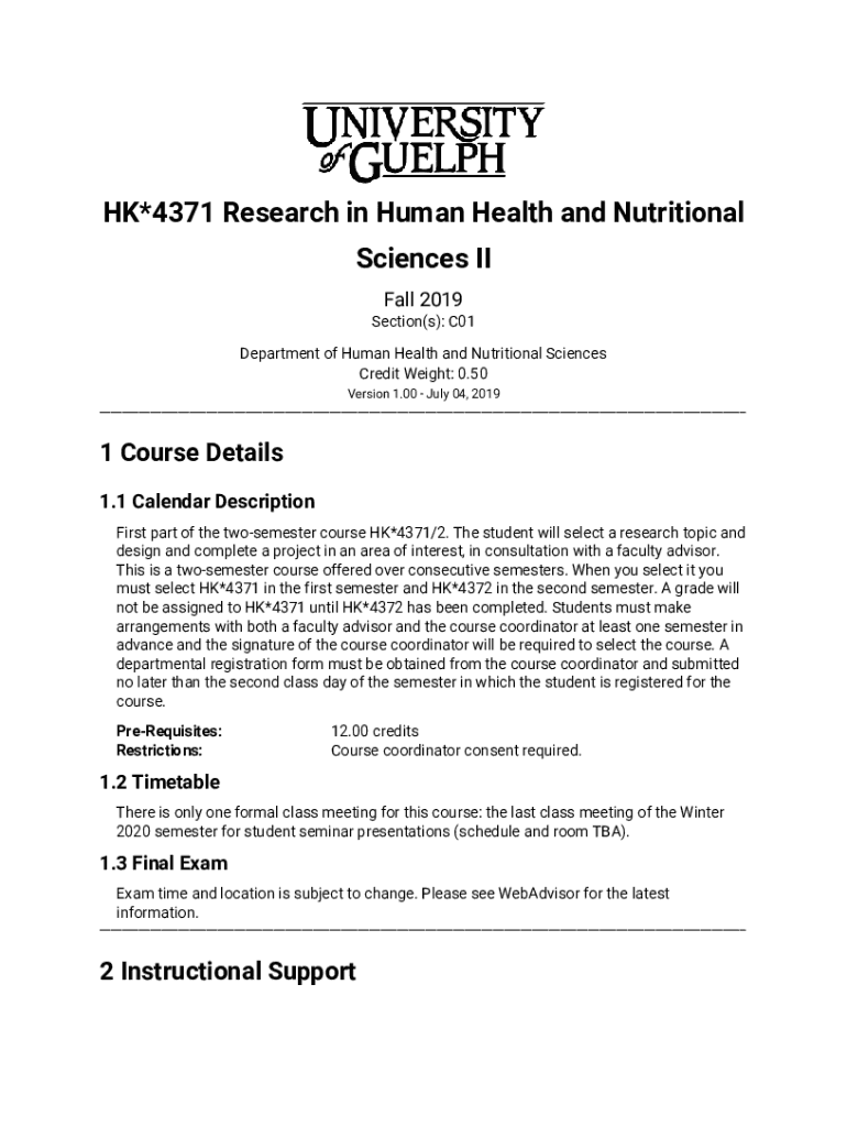 HK*4371 Research in Human Health and Nutritional Sciences II Fall 2019 Section(s): C01 Department of Human Health and Nutritional Sciences Credit Weight: 0.50 Version 1.00 July 04, 2019 ___1 Course