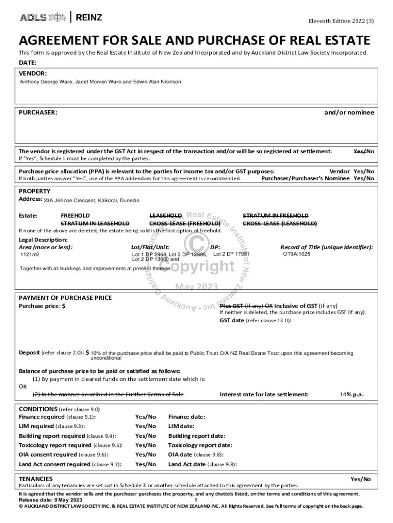 Eleventh Edition 2022 (3)AGREEMENT FOR SALE AND PURCHASE OF REAL ESTATE This form is approved by the Real Estate Institute of New Zealand Incorporated and by Auckland District Law Society Incorporated.DATE: