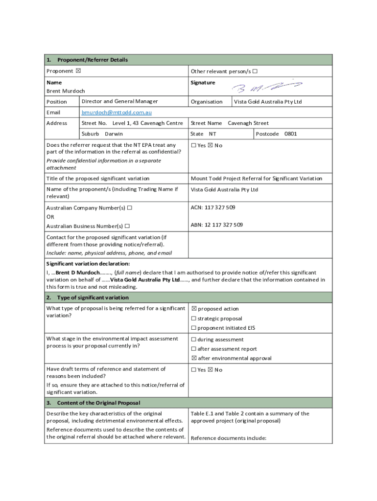 1.Proponent/Referrer DetailsProponent Other relevant person/s NameSignatureBrent Murdoch PositionDirector and General ManagerEmailbmurdoch@mttodd.com.auAddressStreet No. Level 1, 43 Cavenagh CentreStreet