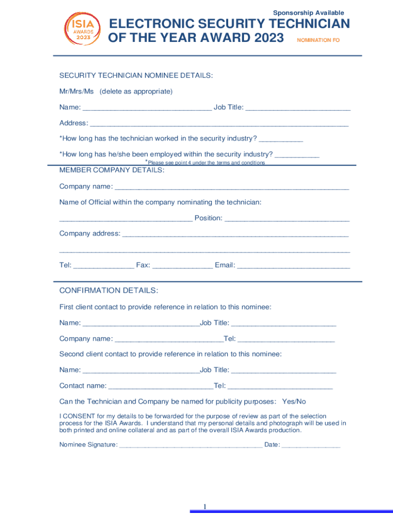 Sponsorship AvailableELECTRONIC SECURITY TECHNICIAN OF THE YEAR AWARD 2023 NOMINATION FO SECURITY TECHNICIAN NOMINEE DETAILS: Mr/Mrs/Ms (delete as appropriate) Name: ___ Job Title: ___ Address: ___