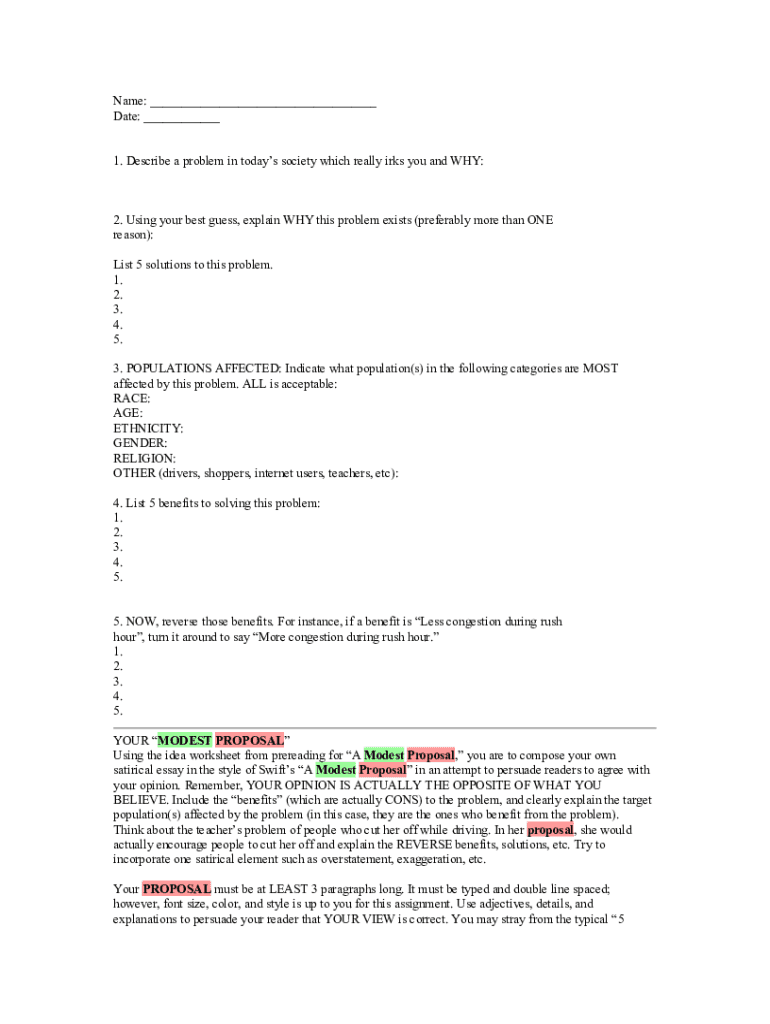 Name: ___ Date: ___ 1. Describe a problem in todays society which really irks you and WHY:2. Using your best guess, explain WHY this problem exists (preferably more than ONE reason): List 5 solutions