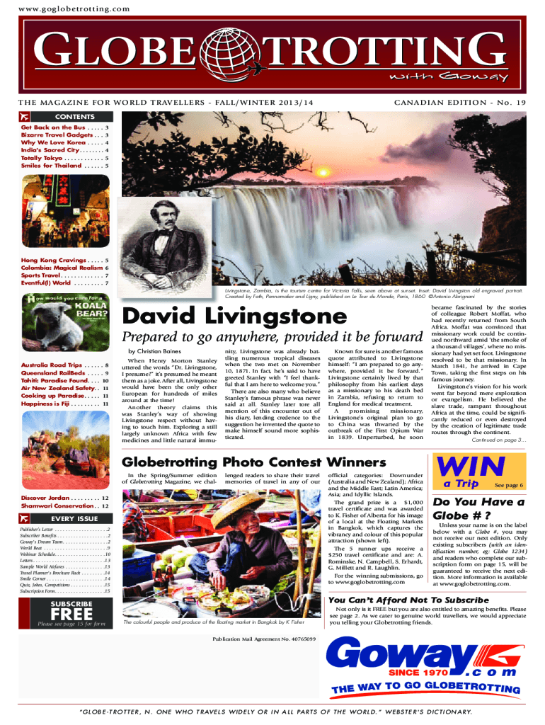 W w w. go globe t rotti n g .c omTH E M AG A Z I N E FOR WOR LD T R AV ELLERS FALL/WI NTER 2013/14CA NA DI A N EDI T I O N No. 19CONTENTS