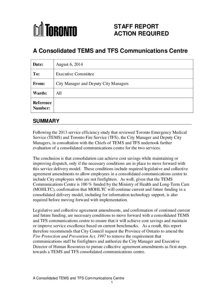 STAFF REPORT ACTION REQUIRED A Consolidated TEMS and TFS Communications Centre Date:August 6, 2014To:Executive CommitteeFrom:City Manager and Deputy City ManagersWards:AllReference Number:SUMMARY