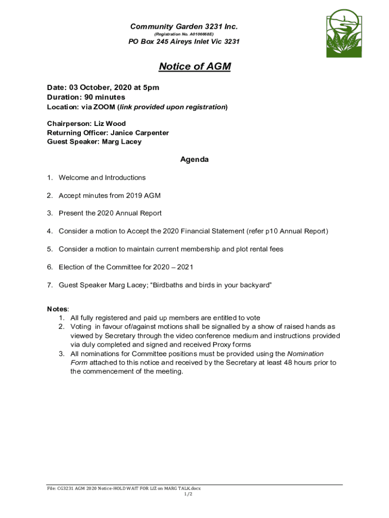 Community Garden 3231 Inc. (Registration No. A0106668E)PO Box 245 Aireys Inlet Vic 3231Notice of AGM Date: 03 October, 2020 at 5pm Duration: 90 minutes Location: via ZOOM (link provided upon registration)