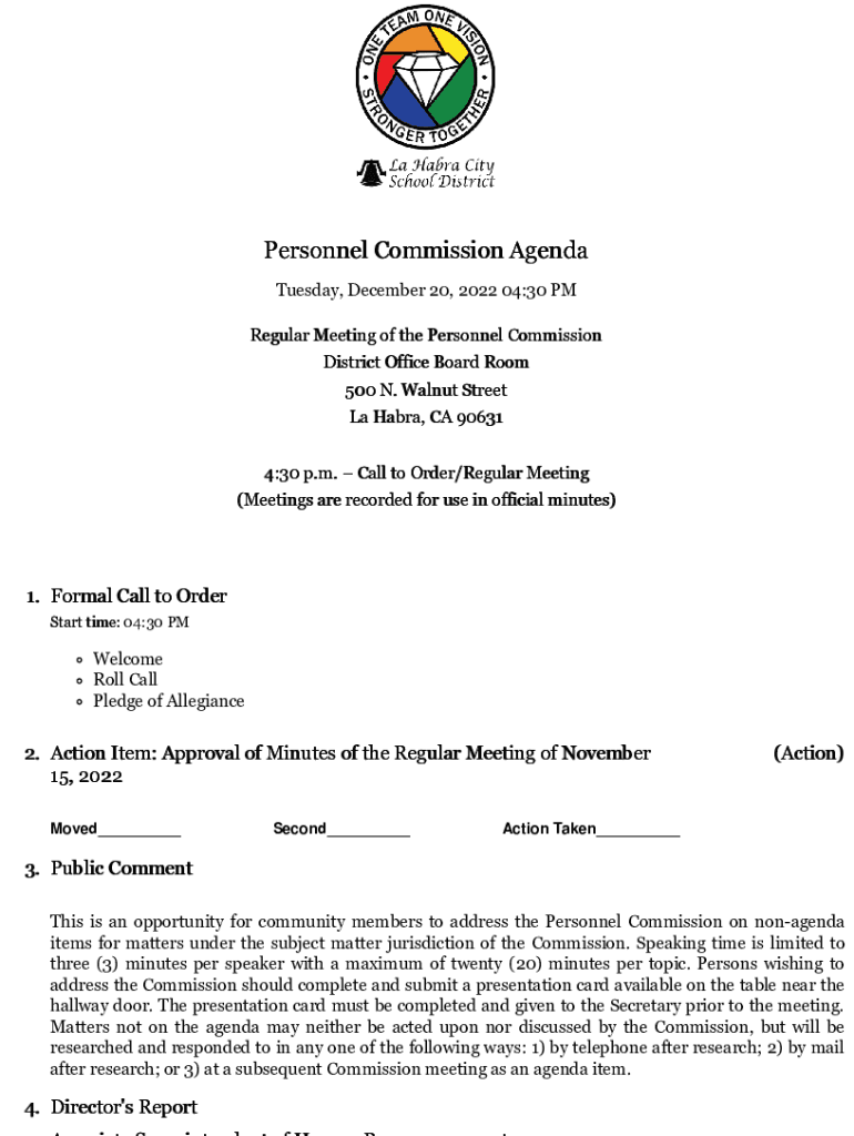 Personnel Commission Agenda Tuesday, December 20, 2022 04:30 PM Regular Meeting of the Personnel Commission District Office Board Room 500 N. Walnut Street La Habra, CA 90631 4:30 p.m. Call to Order/Regular