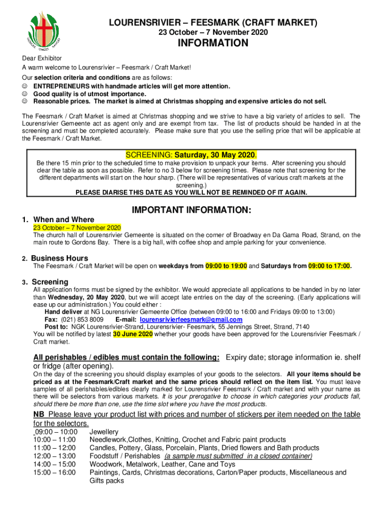 LOURENSRIVIER FEESMARK (CRAFT MARKET) 23 October 7 November 2020INFORMATION Dear Exhibitor A warm welcome to Lourensrivier Feesmark / Craft Market! Our selection criteria and conditions are as follows: