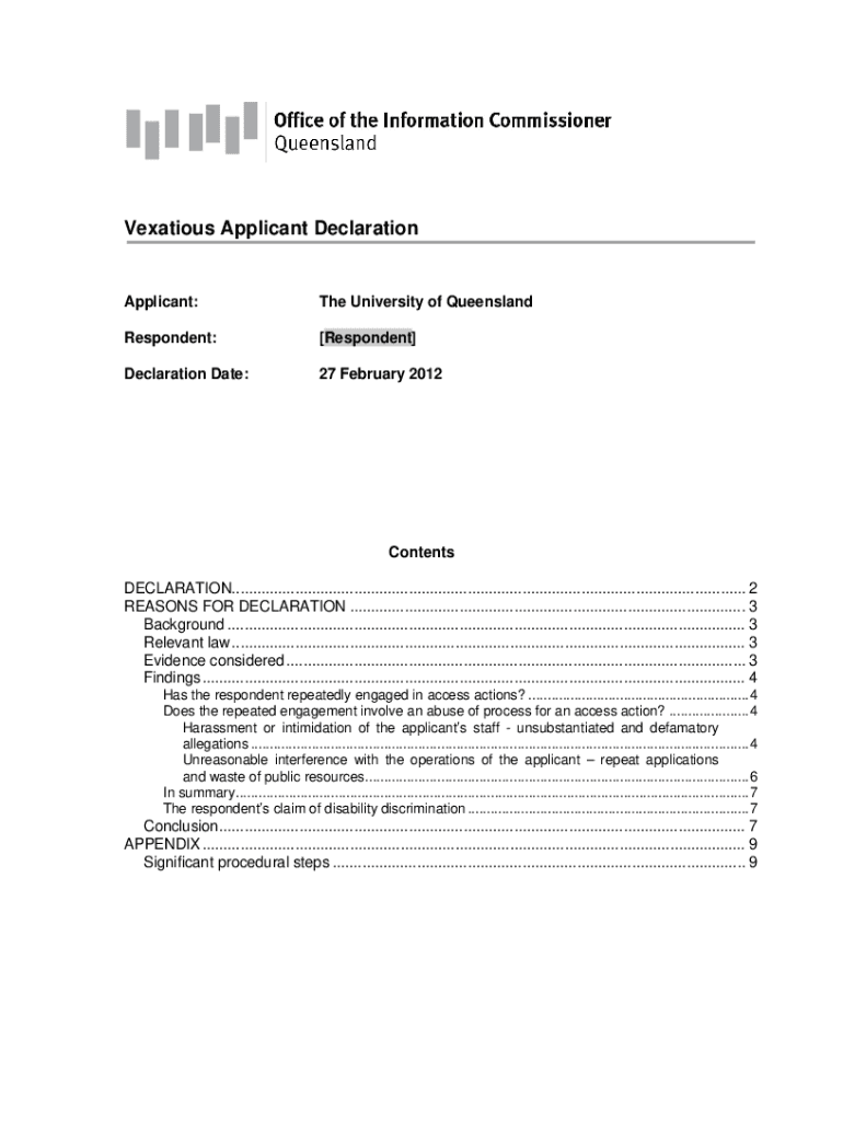 Vexatious Applicant DeclarationApplicant:The University of QueenslandRespondent:[Respondent]Declaration Date:27 February 2012Contents DECLARATION..........................................................................................................................
