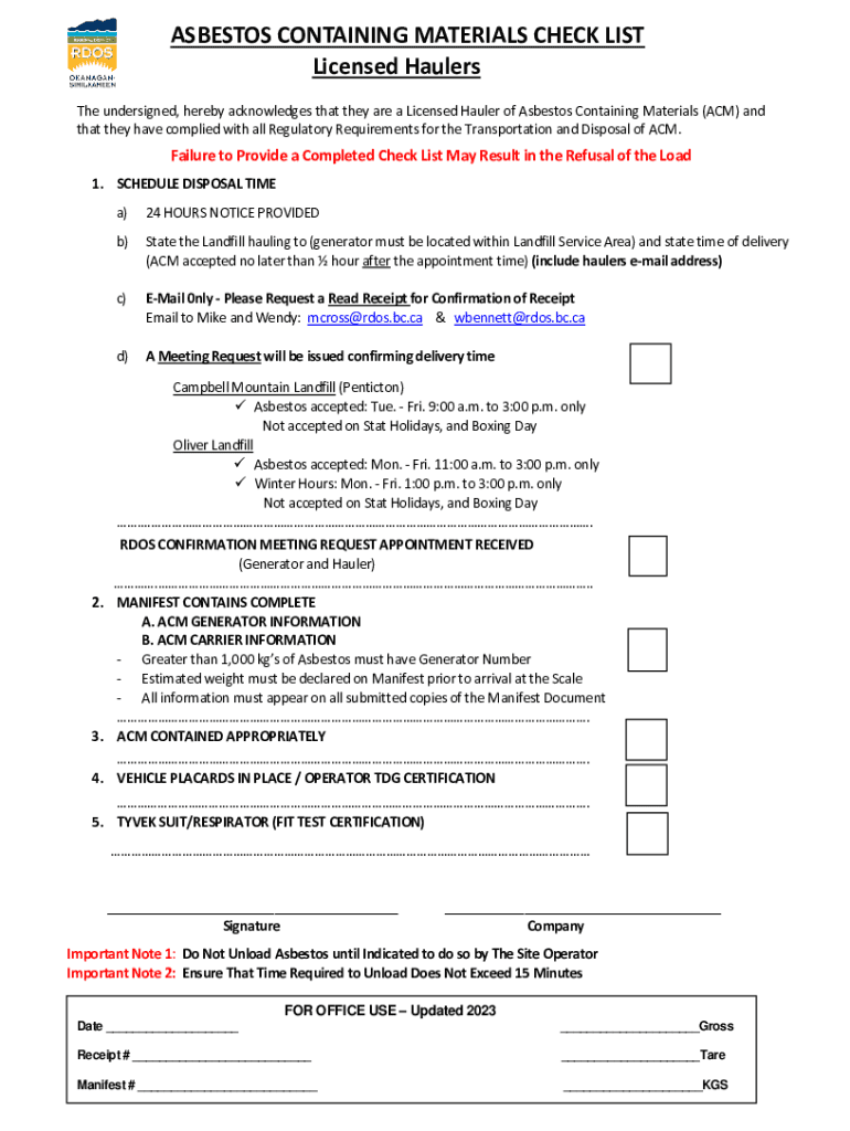 ASBESTOS CONTAINING MATERIALS CHECK LIST Licensed Haulers The undersigned, hereby acknowledges that they are a Licensed Hauler of Asbestos Containing Materials (ACM) and that they have complied with