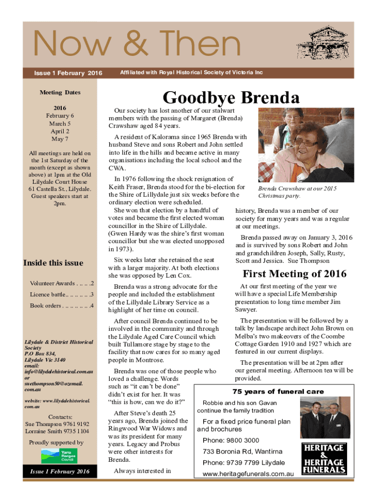 Now & Then Issue 1 February 2016 Meeting Dates 2016 February 6 March 5 April 2 May 7 All meetings are held on the 1st Saturday of the month (except as shown above) at 1pm at the Old Lilydale Court
