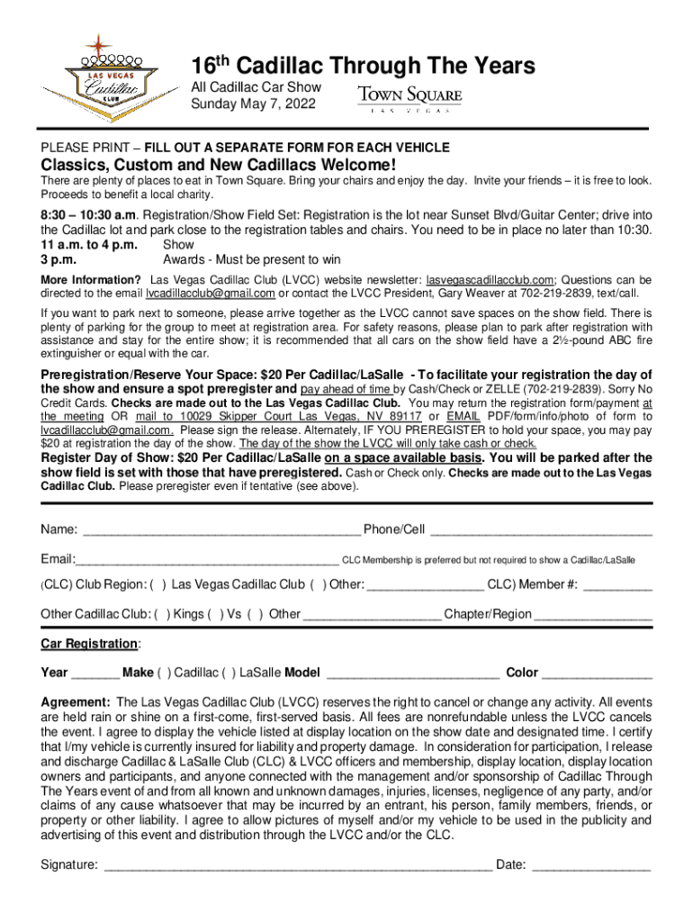 PLEASE PRINT FILL OUT A SEPARATE FORM FOR EACH VEHICLEClassics, Custom and New Cadillacs Welcome!