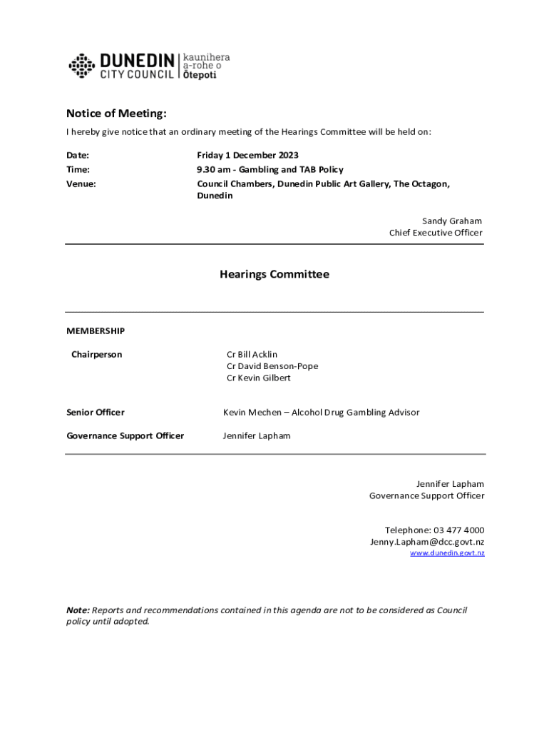 Notice of Meeting: I hereby give notice that an ordinary meeting of the Hearings Committee will be held on: Date: Time: Venue:Friday 1 December 2023 9.30 am Gambling and TAB Policy Council Chambers,
