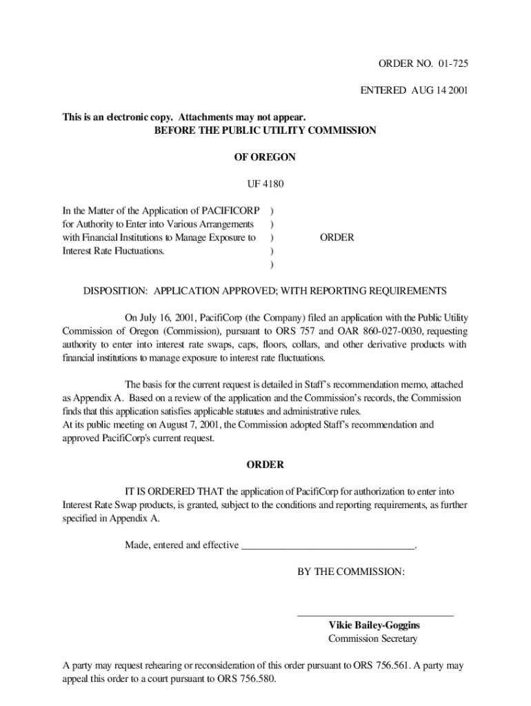 ORDER NO. 01725 ENTERED AUG 14 2001 This is an electronic copy. Attachments may not appear. BEFORE THE PUBLIC UTILITY COMMISSION OF OREGON UF 4180 In the Matter of the Application of PACIFICORP for
