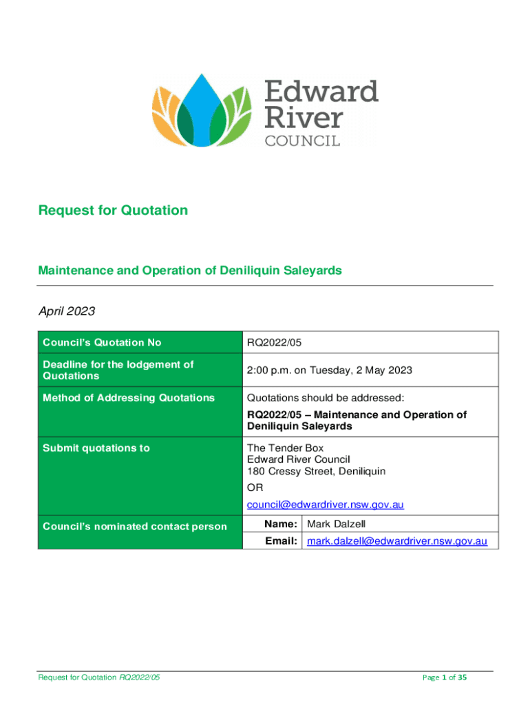Request for QuotationMaintenance and Operation of Deniliquin SaleyardsApril 2023 Councils Quotation NoRQ2022/05Deadline for the lodgement of Quotations2:00 p.m. on Tuesday, 2 May 2023Method of Addressing
