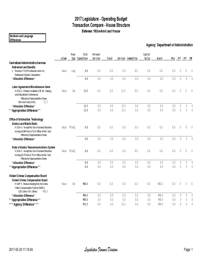 2017 Legislature Operating Budget Transaction Compare House Structure Between 18GovAmd and House Numbers and Language DifferencesAgency: Department of Administration Trans Total Personal Capital Column