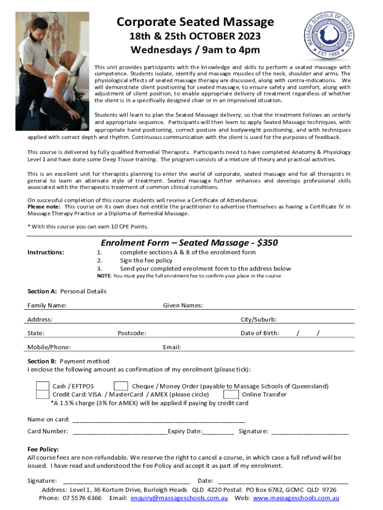 Corporate Seated Massage 18th & 25th OCTOBER 2023 Wednesdays / 9am to 4pm This unit provides participants with the knowledge and skills to perform a seated massage with competence. Students isolate,