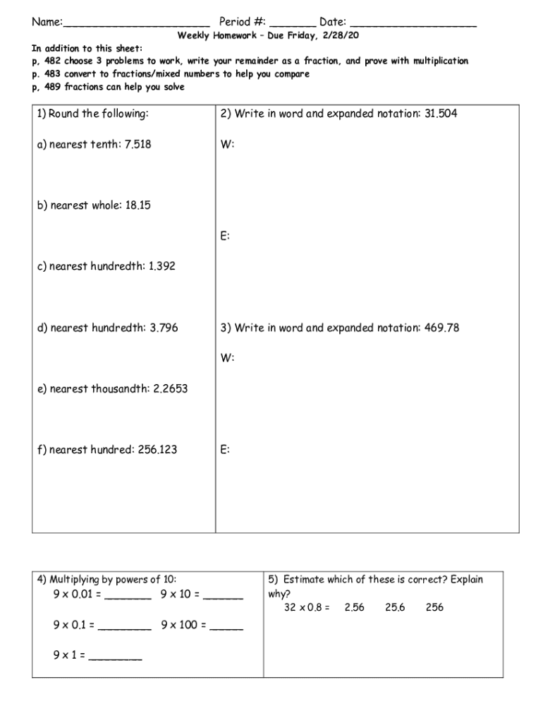 Name:___ Period #: ___ Date: ___ Weekly Homework Due Friday, 2/28/20 In p, p. p,addition to this sheet: 482 choose 3 problems to work, write your remainder as a fraction, and prove with multiplication