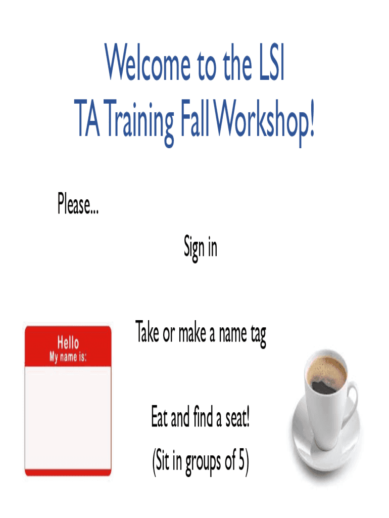 (Sit in groups of 5)TA Training Program Fall Workshop