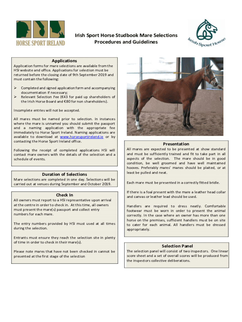 Irish Sport Horse Studbook Mare Selections Procedures and GuidelinesApplications Application forms for mare selections are available from the HSI website and office. Applications for selection must