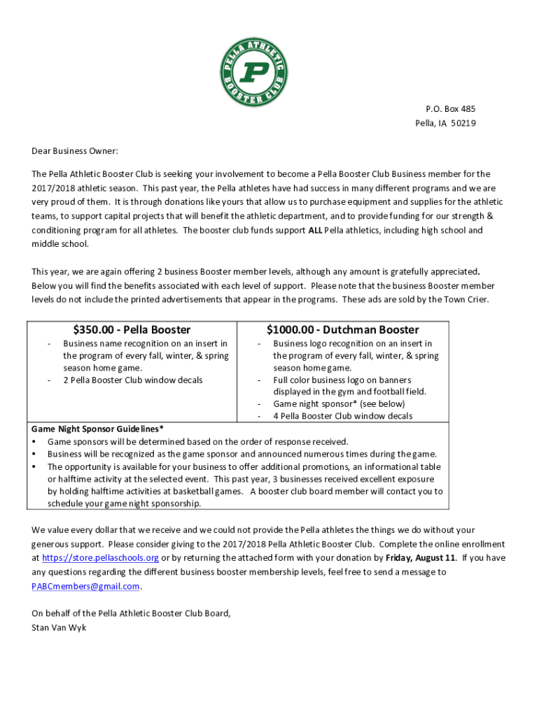Dear Business Owner:P.O. Box 485Pella, IA50219The Ella Athletic Booster Club is seeking your involvement to become a Ella Booster Club Business member for the2017/2018 athletic season. This past year,