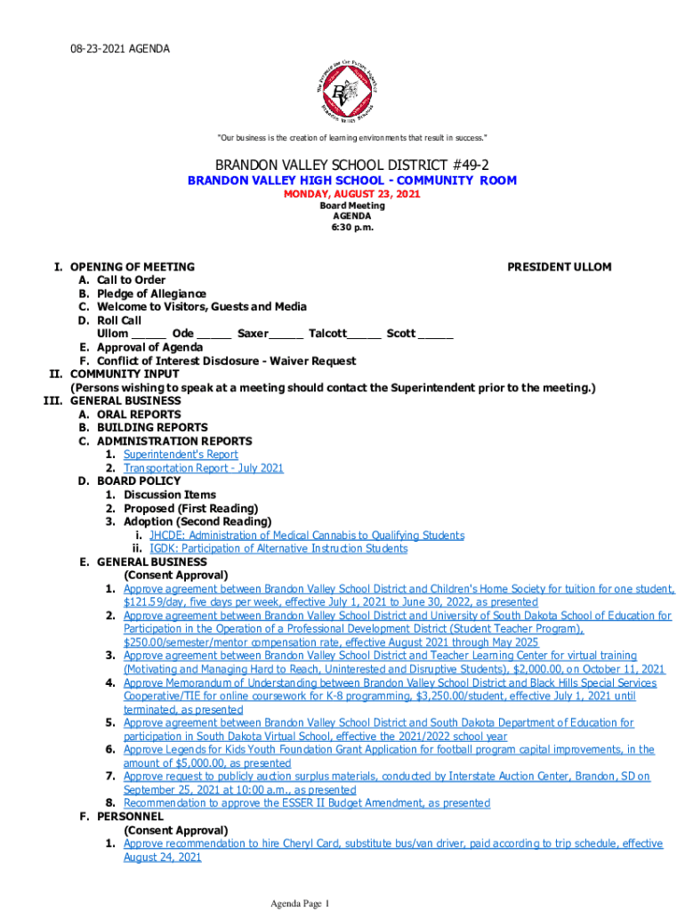 08232021 AGENDA\”Our business is the creation of learning environments that result in success.\”BRANDON VALLEY SCHOOL DISTRICT #492