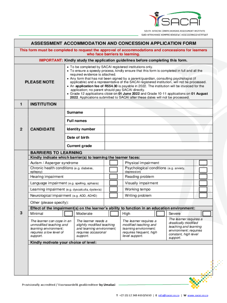 ASSESSMENT ACCOMMODATION AND CONCESSION APPLICATION FORM This form must be completed to request the approval of accommodations and concessions for learners who face barriers to learning. IMPORTANT: