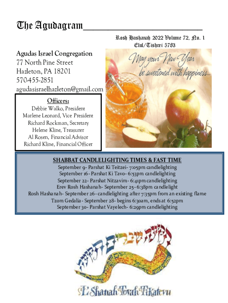 The Agudagram___ Rosh Hashanah 2022 Volume 72, No. 1 Elul/Tishrei 5783Agudas Israel Congregation 77 North Pine Street Hazleton, PA 18201 5704552851 agudasisraelhazleton@gmail.com Officers: Debbie