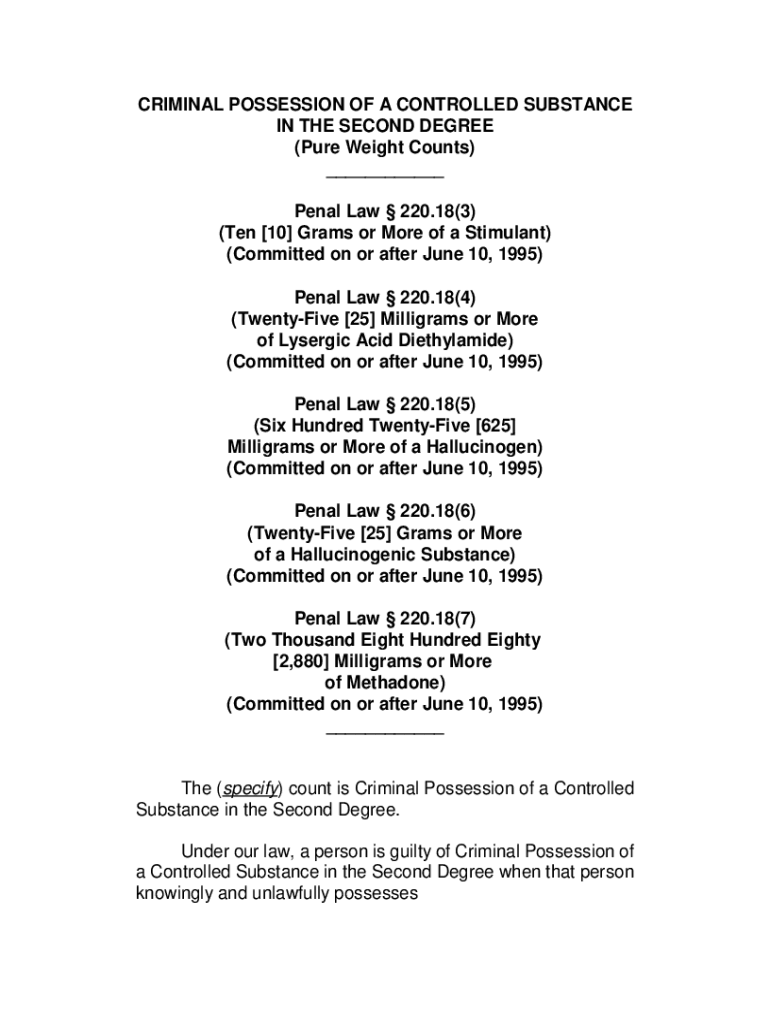 CRIMINAL POSSESSION OF A CONTROLLED SUBSTANCE IN THE SECOND DEGREE (Pure Weight Counts) ___ Penal Law 220.18(3) (Ten [10] Grams or More of a Stimulant) (Committed on or after June 10, 1995) Penal