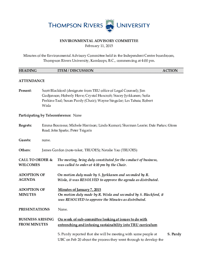 Minutes of the Environmental Advisory Committee held in the Independent Center boardroom,
