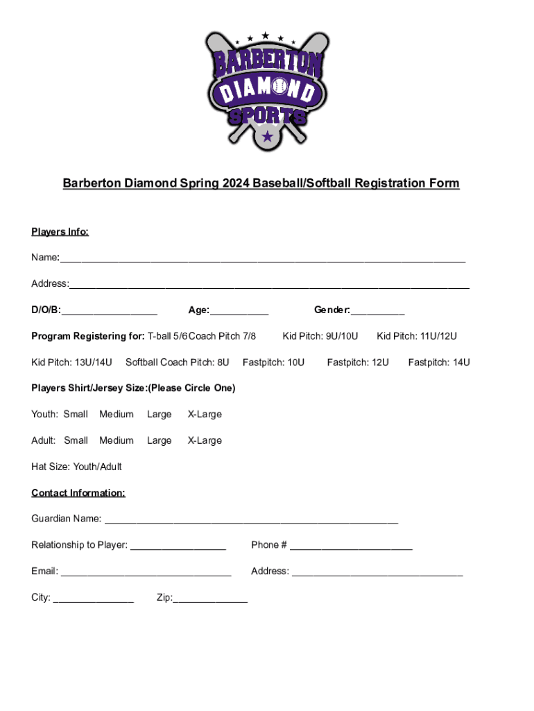 Barberton Diamond Spring 2024 Baseball/Softball Registration Formulates Info: