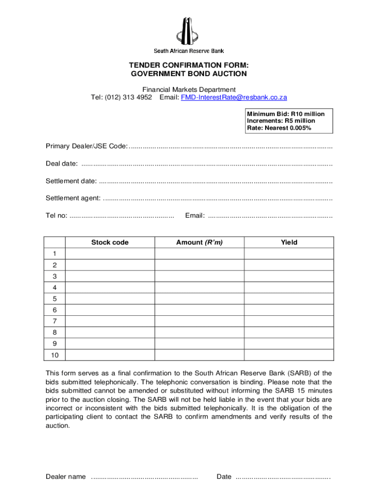 TENDER CONFIRMATION FORM: GOVERNMENT BOND AUCTION Financial Markets Department Tel: (012) 313 4952 Email: FMDInterestRate@resbank.co.za Minimum Bid: R10 million Increments: R5 million Rate: Nearest