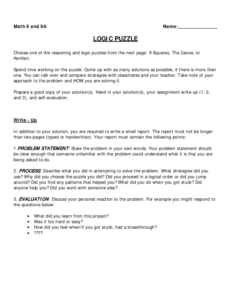 Math 9 and 9AName:LOGIC PUZZLE Choose one of the reasoning and logic puzzles from the next page: 9 Squares, The Canoe, or KenKen. Spend time working on the puzzle. Come up with as many solutions as