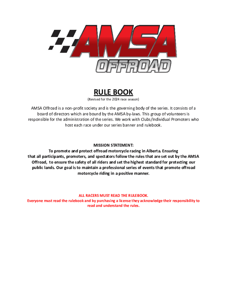 RULE BOOK (Revised for the 2024 race season)AMSA Offroad is a nonprofit society and is the governing body of the series. It consists of a board of directors which are bound by the AMSA bylaws. This