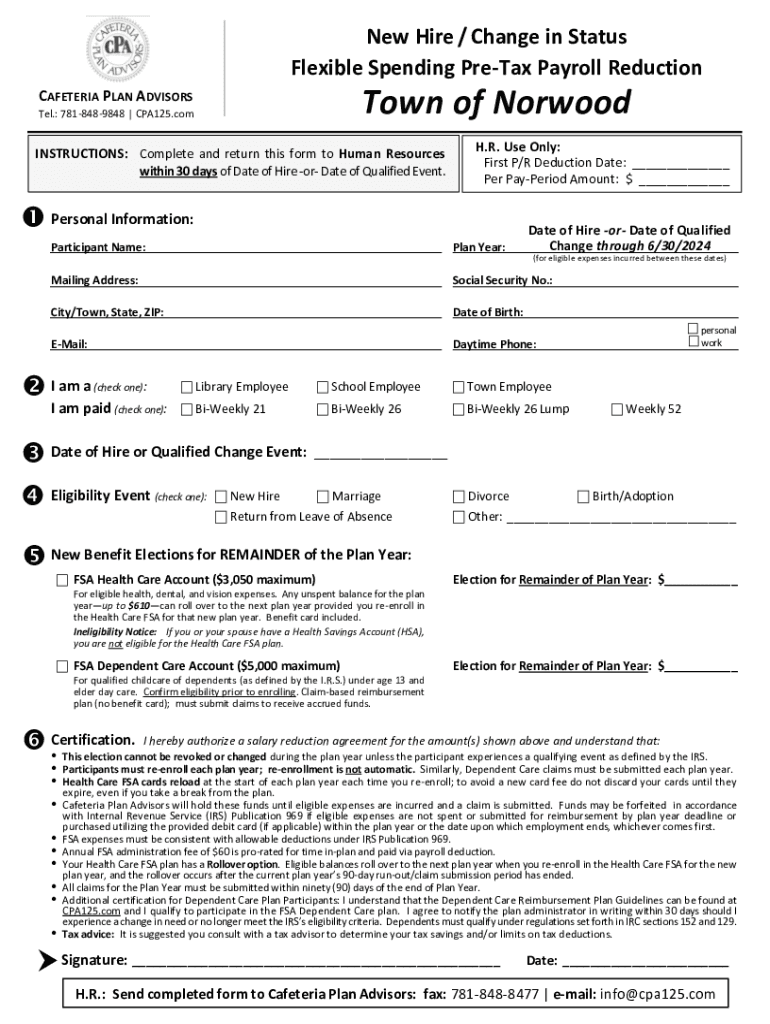 New Hire / Change in Status Flexible Spending PreTax Payroll ReductionTown of NorwoodCAFETERIA PLAN ADVISORS Tel.: 7818489848 | CPA125.comFax:7818488477INSTRUCTIONS: Complete and return this form