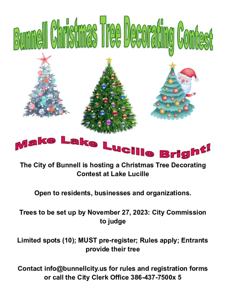 The City of Bunnell is hosting a Christmas Tree Decorating Contest at Lake Lucille Open to residents, businesses and organizations. Trees to be set up by November 27, 2023: City Commission to judge