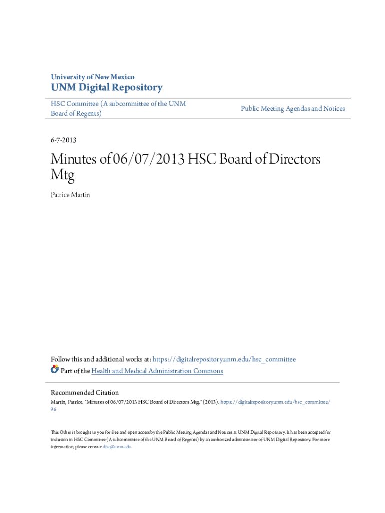 University of New MexicoUNM Digital Repository HSC Committee (A subcommittee of the UNM Board of Regents)Public Meeting Agendas and Notices672013Minutes of 06/07/2013 HSC Board of Directors Mtg Patrice