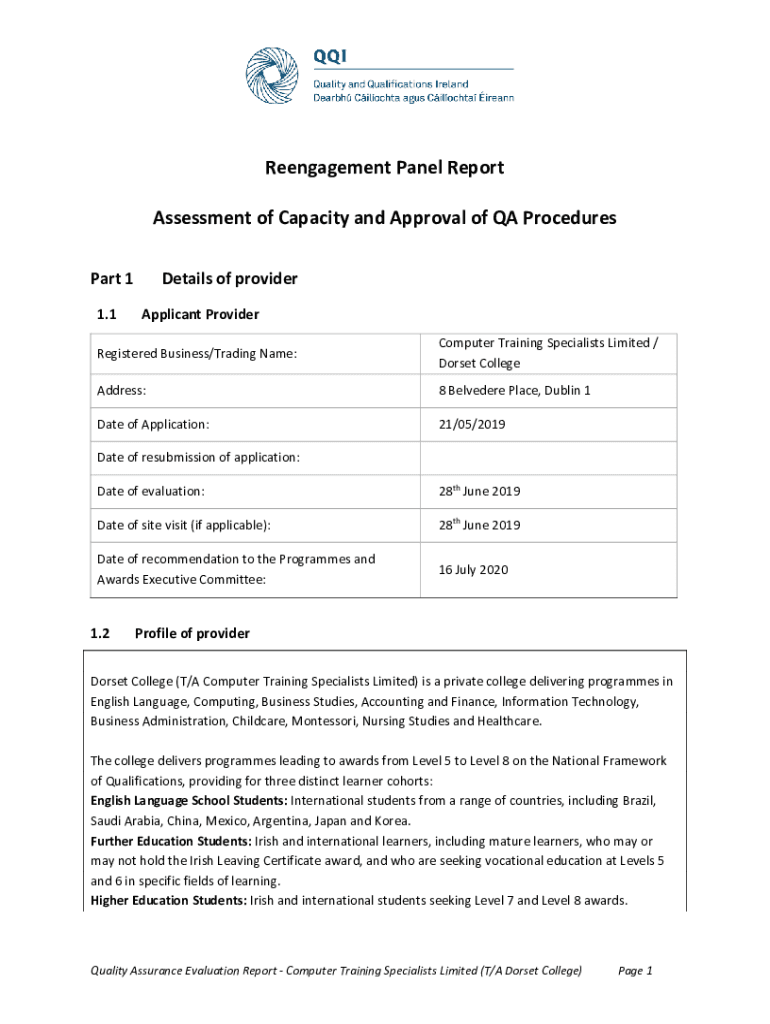 Reengagement Panel Report Assessment of Capacity and Approval of QA Procedures Part 1 1.1Details of provider Applicant ProviderRegistered Business/Trading Name:Computer Training Specialists Limited