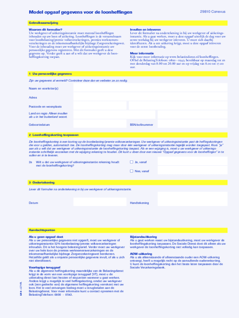 29810 ConexusModel opgaaf gegevens voor de loonheffingen Gebruiksaanwijzing Waarom dit formulier?Invullen en inleverenUw werkgever of uitkeringsinstantie moet meestal loonheffingen inhouden op uw