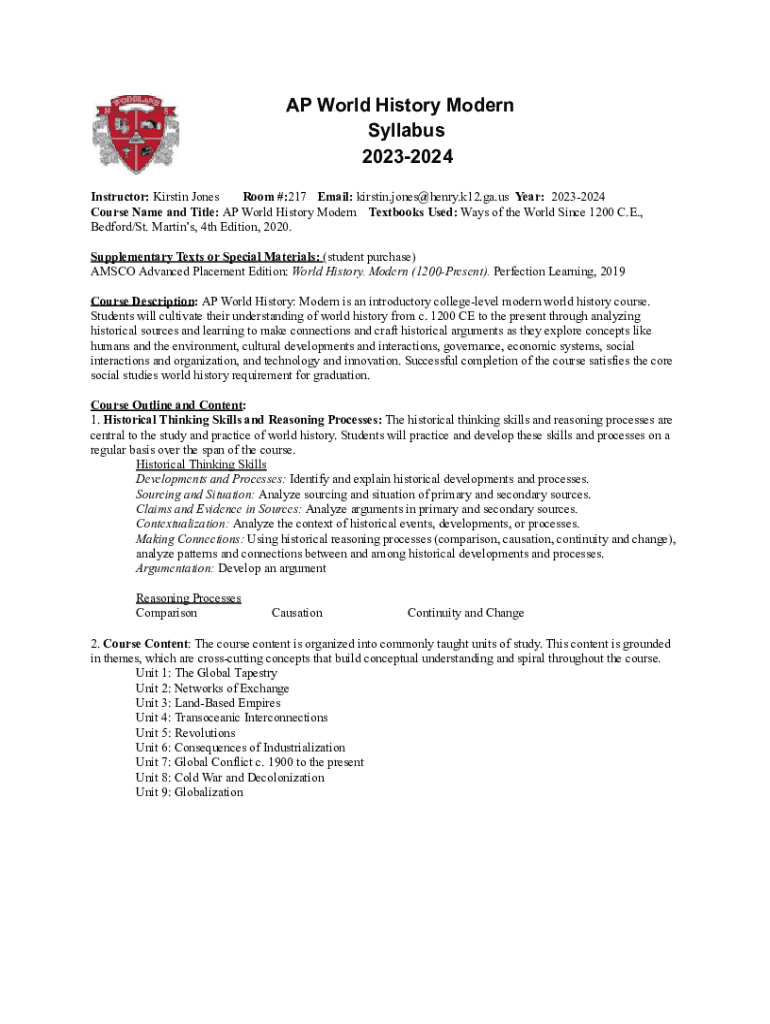 AP World History Modern Syllabus 20232024 Instructor: Kirstin Jones Room #:217 Email: kirstin.jones@henry.k12.ga.us Year: 20232024 Course Name and Title: AP World History Modern Textbooks Used: Ways
