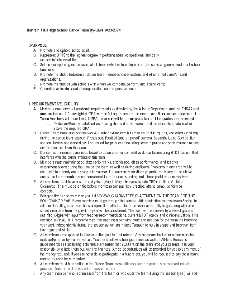 Bartram Trail High School Dance Team ByLaws 20232024 I. PURPOSE A. Promote and uphold school spirit. B. Represent BTHS to the highest degree in performances, competitions, and daily academic/behavioral