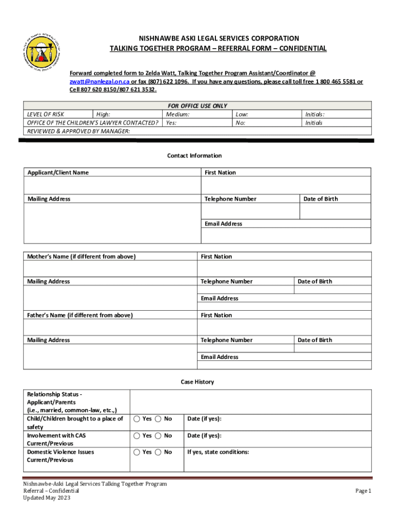 NISHNAWBE ASKI LEGAL SERVICES CORPORATION TALKING TOGETHER PROGRAM REFERRAL FORM CONFIDENTIAL Forward completed form to Zelda Watt, Talking Together Program Assistant/Coordinator @ zwatt@nanlegal.on.ca