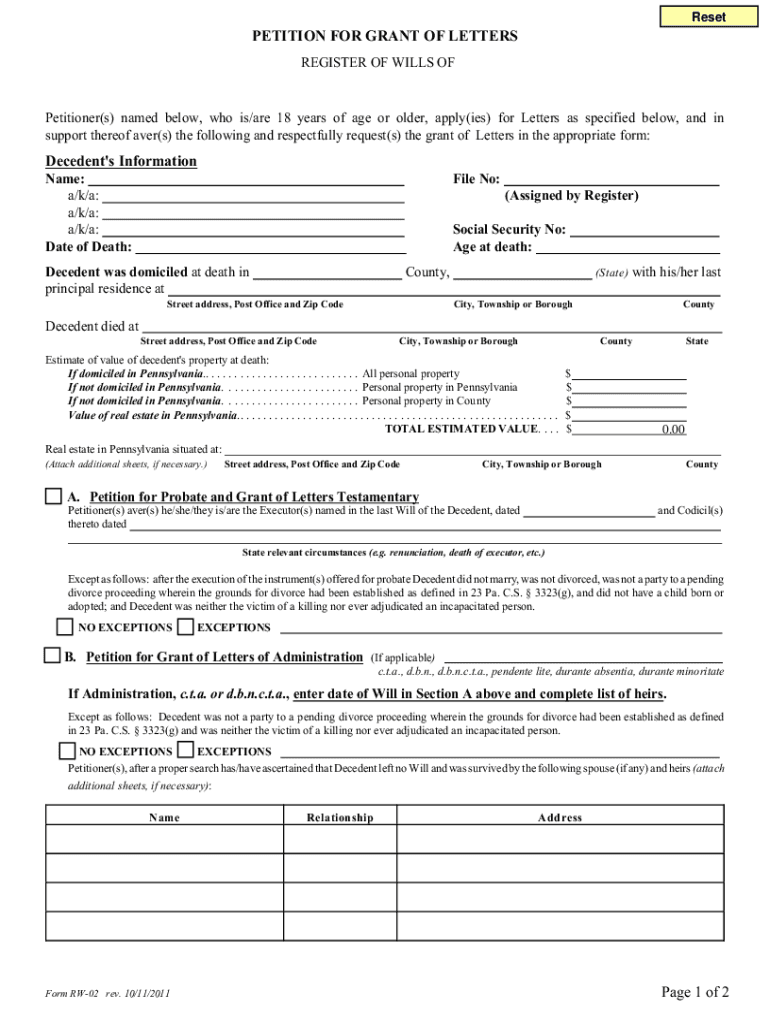ResetPETITION FOR GRANT OF LETTERS REGISTER OF WILLS OFPetitioner(s) named below, who is/are 18 years of age or older, apply(ies) for Letters as specified below, and in support thereof aver(s) the